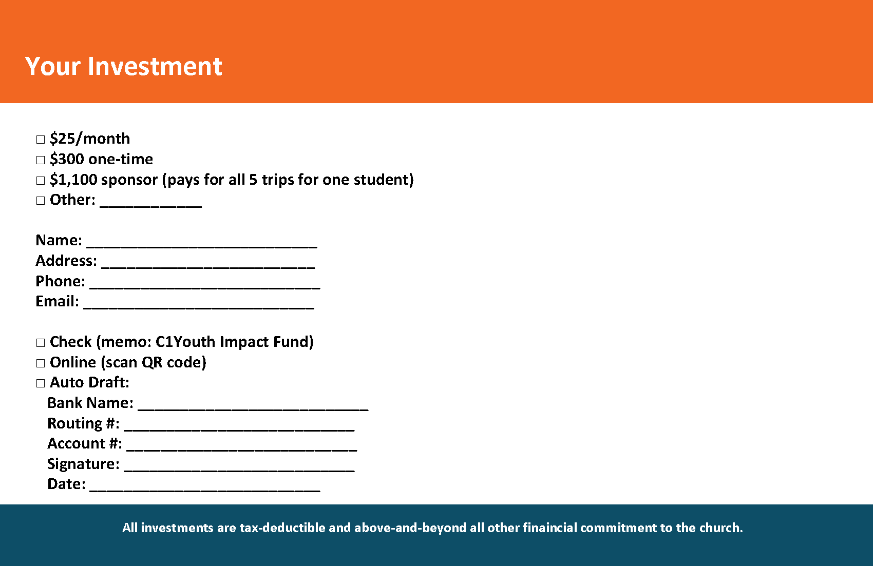 Want to be part of a trip or an event? Fill out this Medical release form and return it to Zach Schrick, Director of Youth ministries.